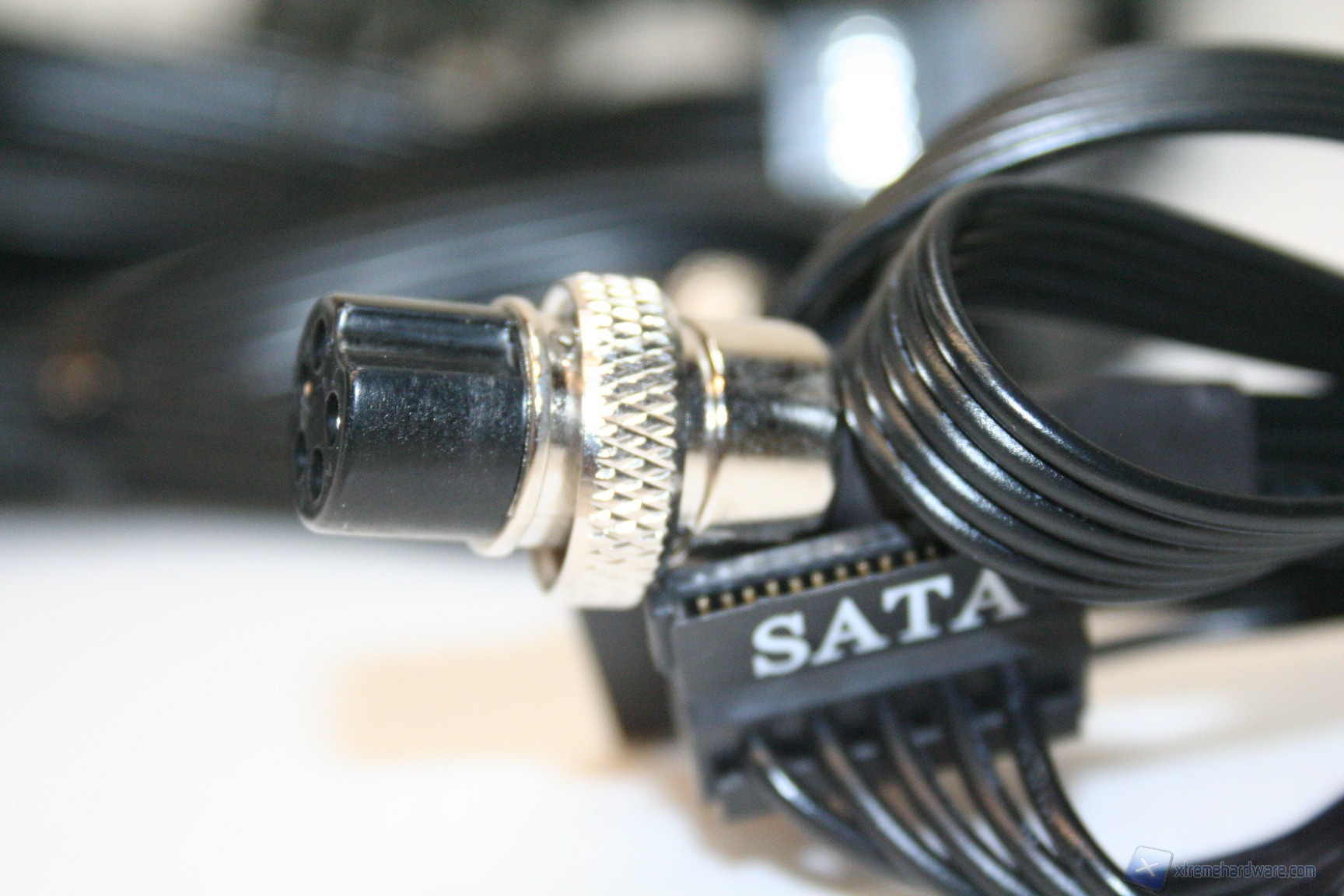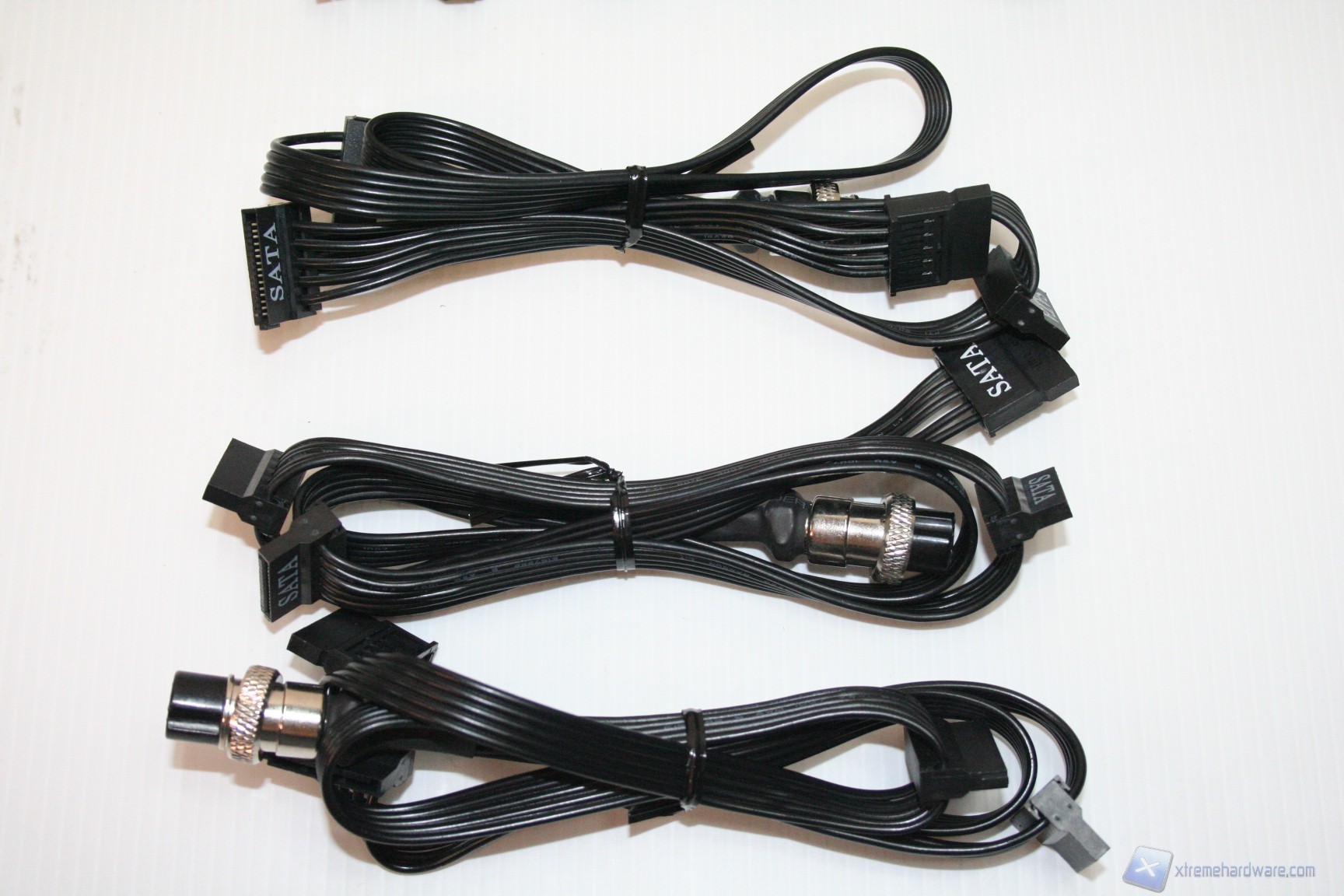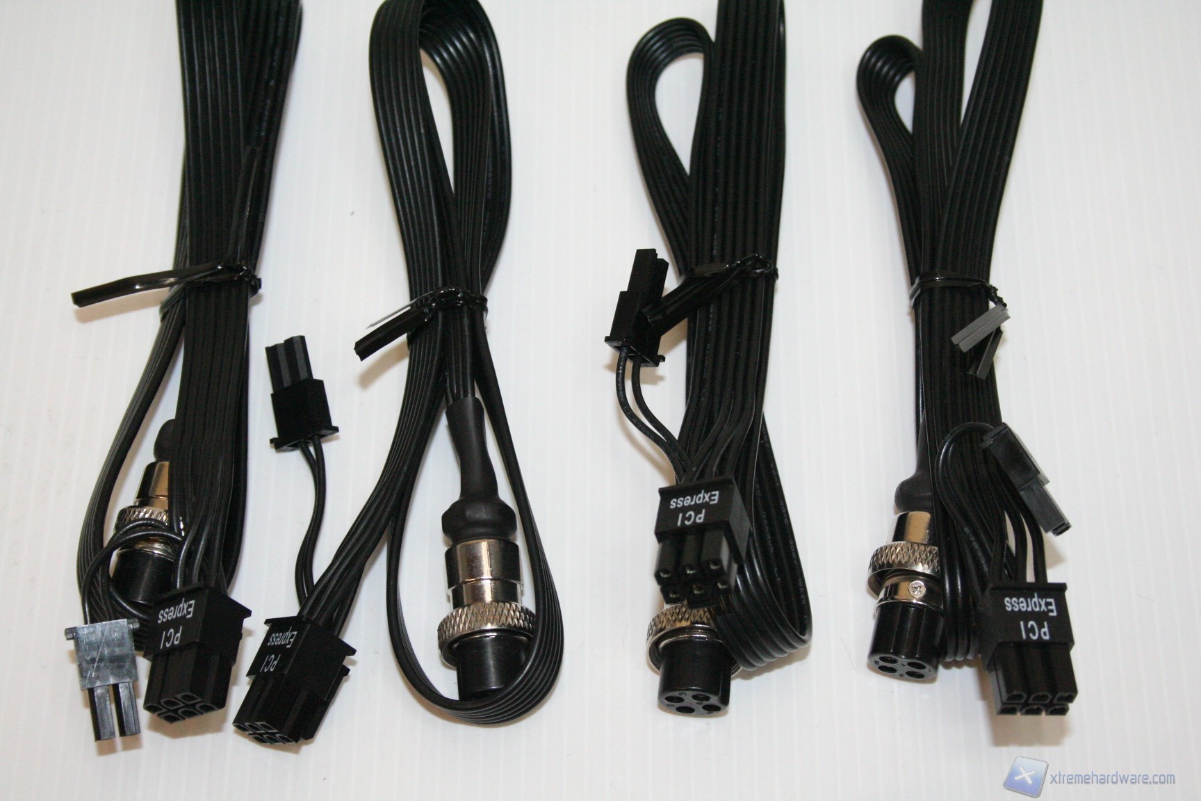 Vi mostriamo una fotografia della lunghezza dei cavi. La lunghezza minima è 580mm, più 15cm per ogni altro connettore secondario; questo permetterà di raggiungere facilmente tutte le periferiche del nostro sistema, anche nel caso di cabinet grandi. Data la presenza di due connettori da 6+2 Pin, molex e connettori di alimentazione SATA, sarà possibile alimentare un sistema davvero potente ed equilibrato, anche per via dell’utilizzo fanless entro i 600W di utilizzo. E’ ovviamente presente il supporto a soluzioni Dual e persino Quad GPU, in quanto sono presenti fino a 6 cavi da 6+2 Pin di alimentazione. Con questo alimentatore potrete installare, senza il minimo problema uno SLI di GTX 690 / oppure un CFX di AMD HD 7990, assieme ad una potente CPU overcloccata. L’alimentatore è parzialmente modulare per via del problema precedentemente espresso ovvero che la tipologia dei connettori posteriori ha impedito il conferimento di una completa modularità. E’ ottimo lo sleeving dei cavi come la tipologia dei connettori modulari, notevole la flessibilità e lo spessore contenuto dei cavi.