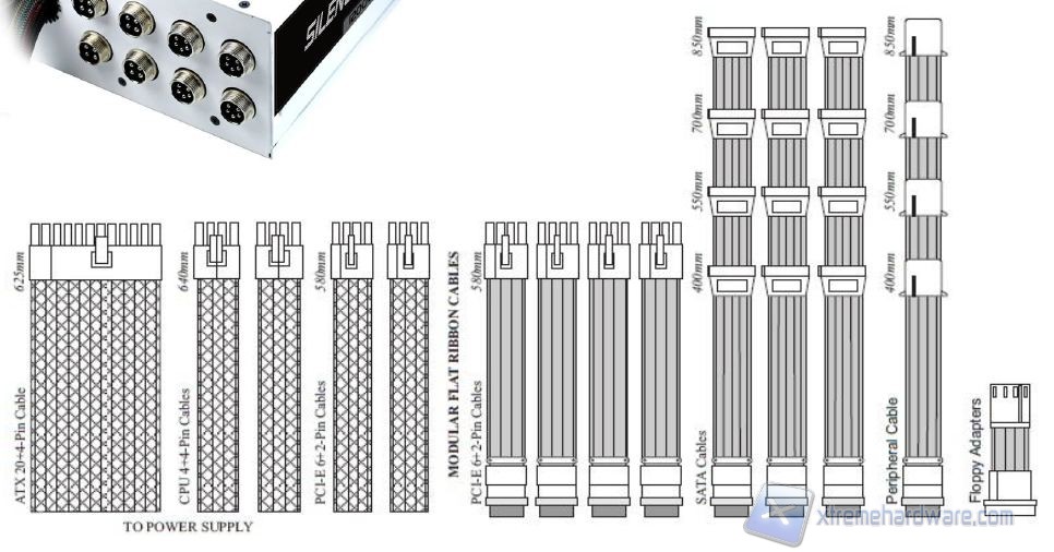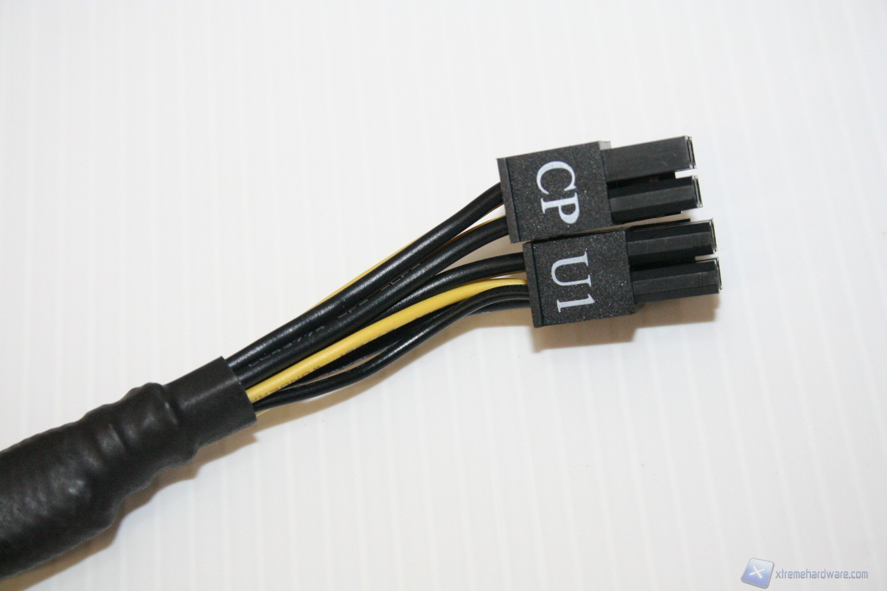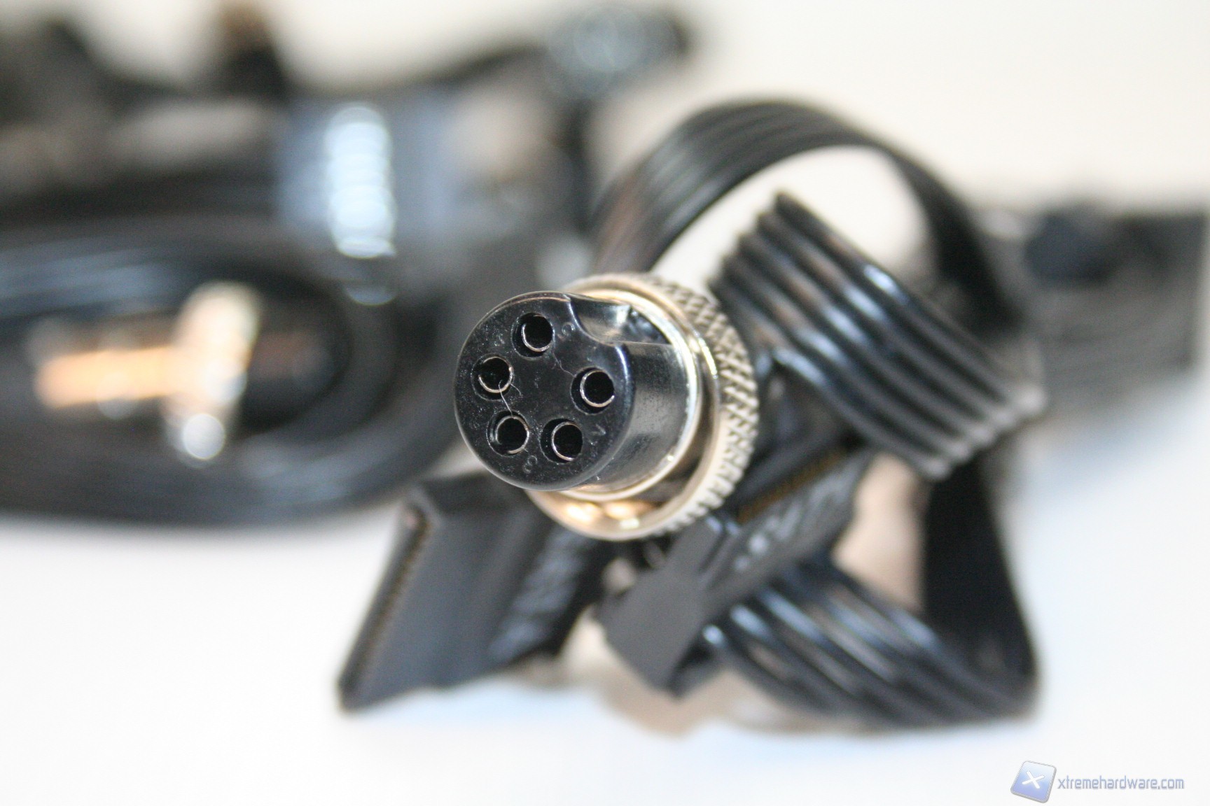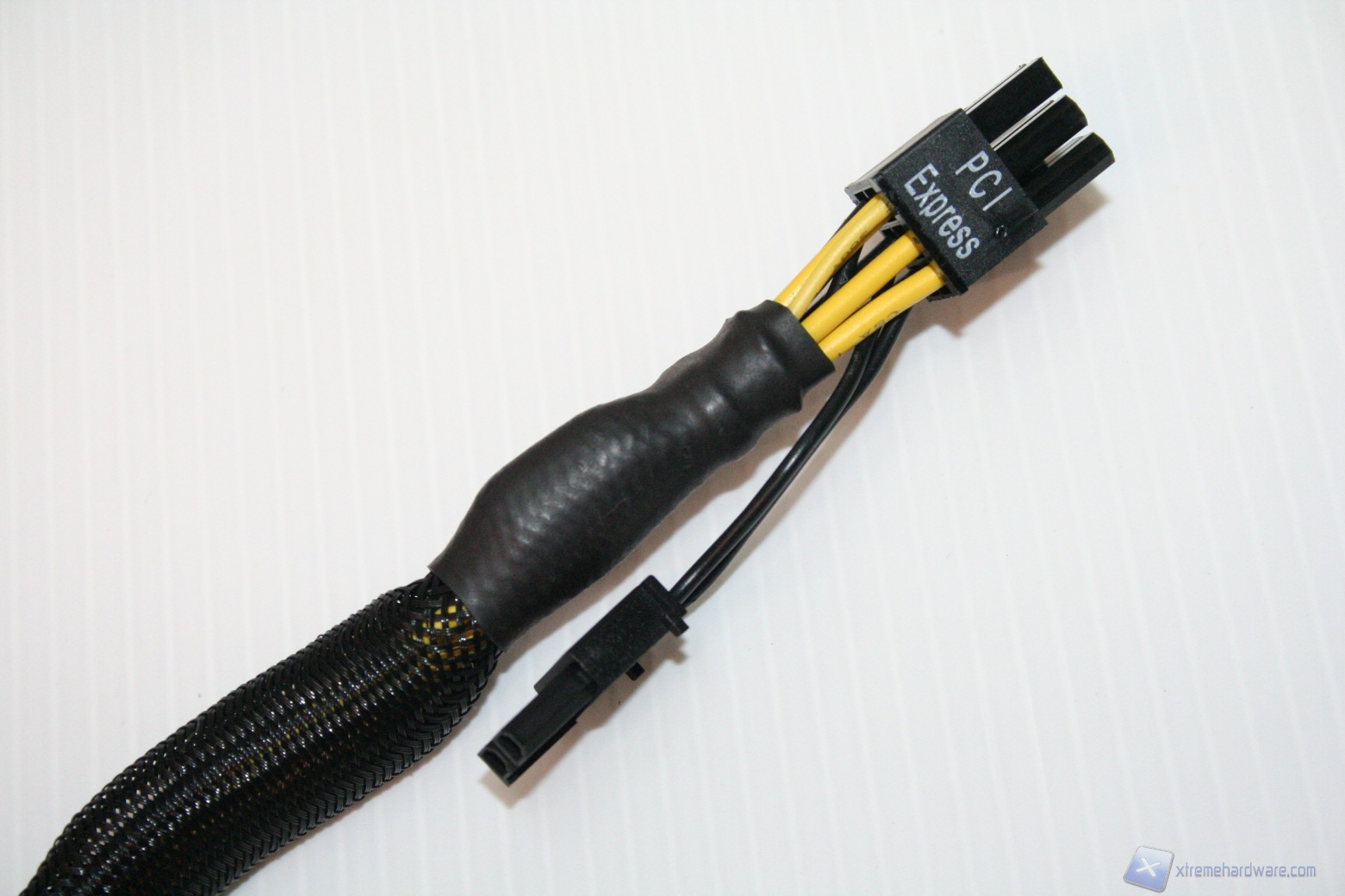 Vi mostriamo una fotografia della lunghezza dei cavi. La lunghezza minima è 580mm, più 15cm per ogni altro connettore secondario; questo permetterà di raggiungere facilmente tutte le periferiche del nostro sistema, anche nel caso di cabinet grandi. Data la presenza di due connettori da 6+2 Pin, molex e connettori di alimentazione SATA, sarà possibile alimentare un sistema davvero potente ed equilibrato, anche per via dell’utilizzo fanless entro i 600W di utilizzo. E’ ovviamente presente il supporto a soluzioni Dual e persino Quad GPU, in quanto sono presenti fino a 6 cavi da 6+2 Pin di alimentazione. Con questo alimentatore potrete installare, senza il minimo problema uno SLI di GTX 690 / oppure un CFX di AMD HD 7990, assieme ad una potente CPU overcloccata. L’alimentatore è parzialmente modulare per via del problema precedentemente espresso ovvero che la tipologia dei connettori posteriori ha impedito il conferimento di una completa modularità. E’ ottimo lo sleeving dei cavi come la tipologia dei connettori modulari, notevole la flessibilità e lo spessore contenuto dei cavi.